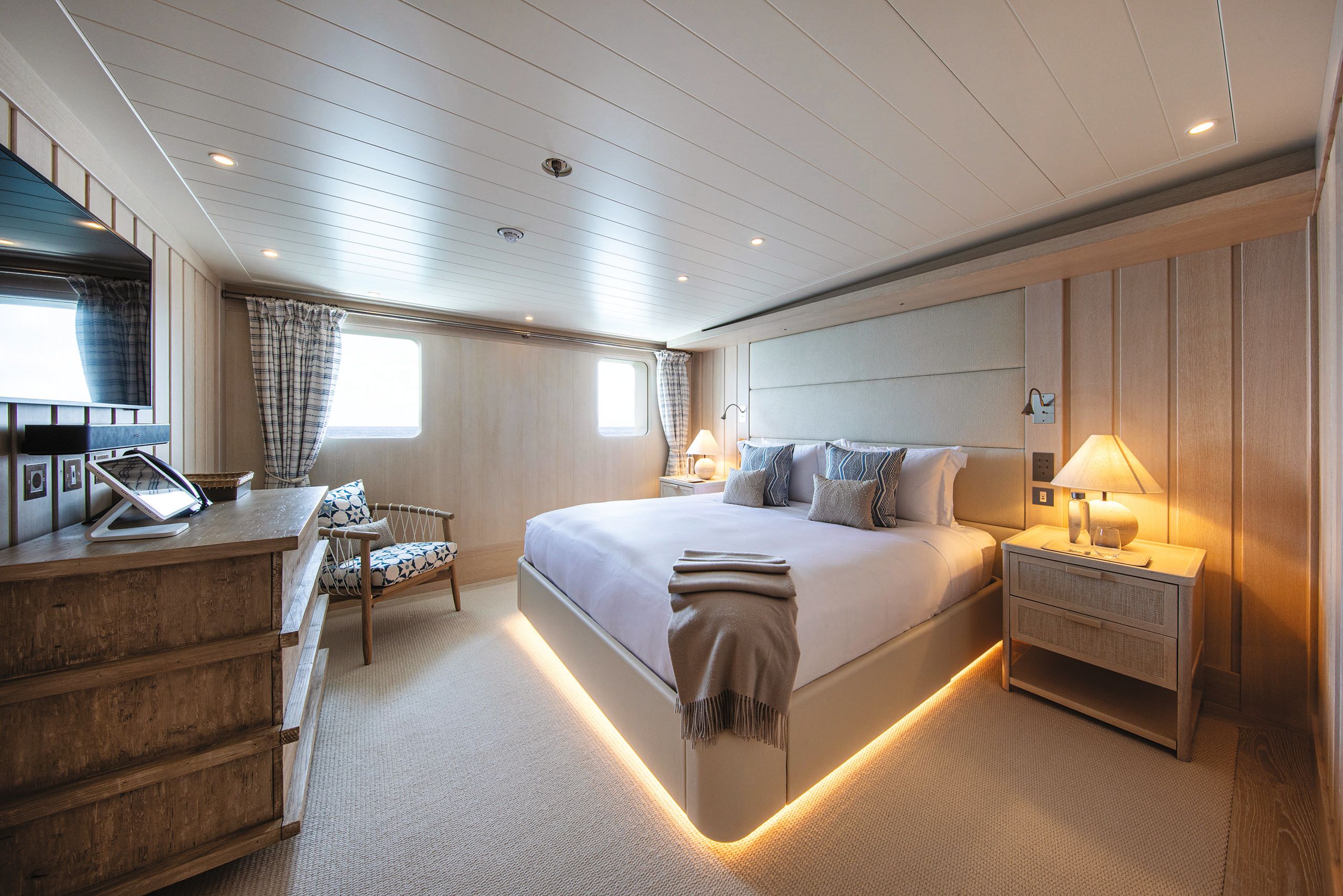 Guests are accommodated on the main deck in two VIP cabins (top left, pre-refit and top right, post-refit). Despite the constraint of low ceilings, RWD was still able to achieve a light and spacious feeling in the guest cabins, pairing limed oak with white timber overheads