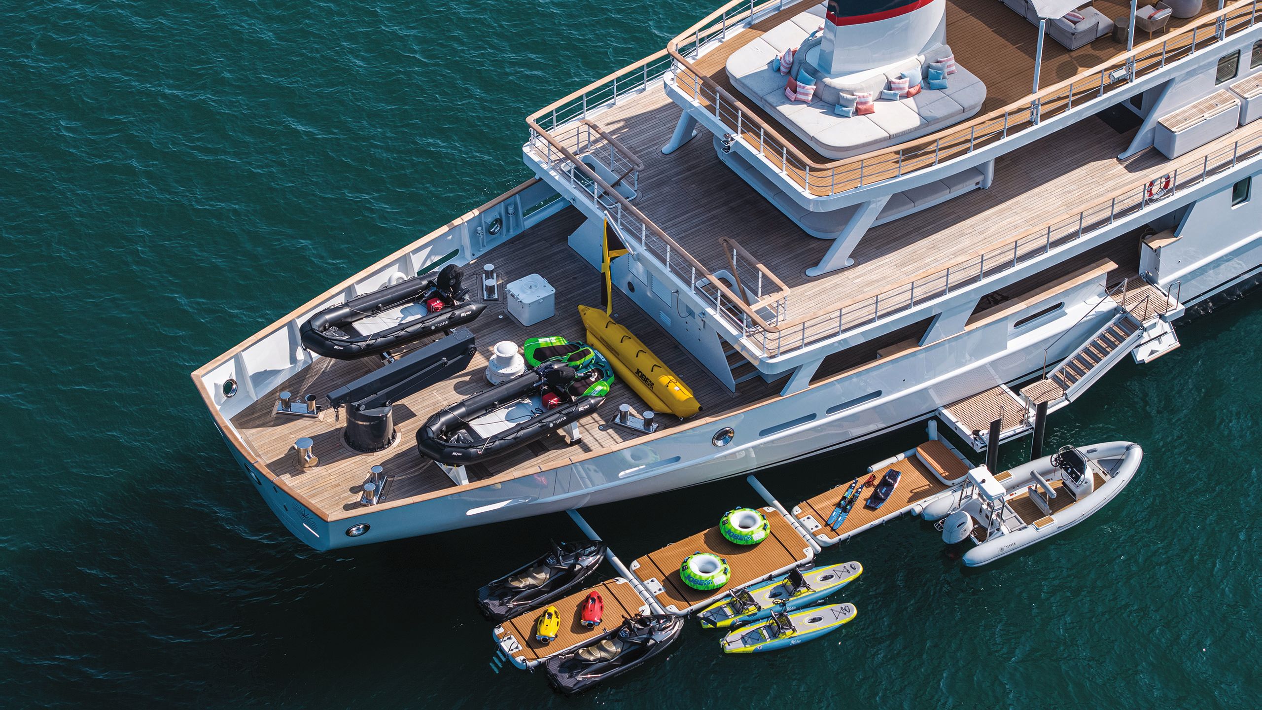The vessel currently carries six tenders, including three expedition Zodiac Milpros and a 10-metre Scorpion, two jet skis, 16 bikes, foils, ski touring equipment, SUPs, kayaks for both temperate and polar waters, a variety of towables, indoor and outdoor gym set-ups, an outdoor cinema and, as mentioned, the upper deck is also a games court. The scuba dive room includes a hyperbaric chamber, with many crew trained in this speciality.