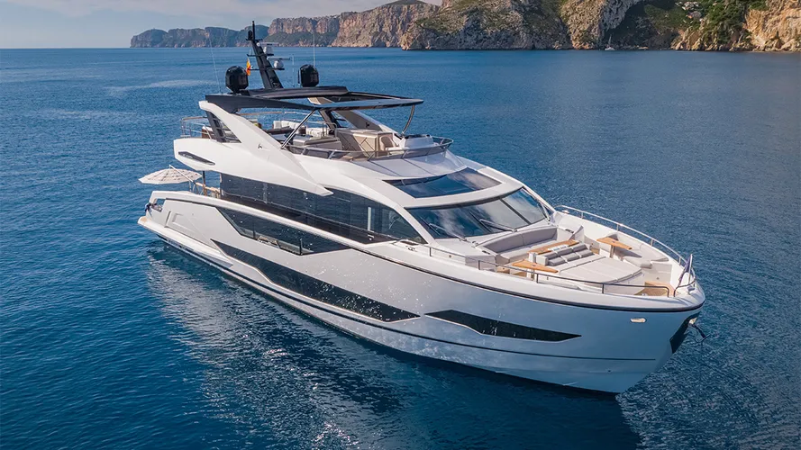 Step aboard 1 LORENA, the brand new Sunseeker 90 Ocean that embodies modern luxury, open space, and effortless comfort. From the moment you enter the main salon, you’re greeted by massive, floor-to-ceiling windows that flood the space with natural light and offer sweeping ocean views. The open-plan design and elegant décor create a bright, inviting atmosphere which is perfect for relaxing with family or entertaining guests in refined comfort.