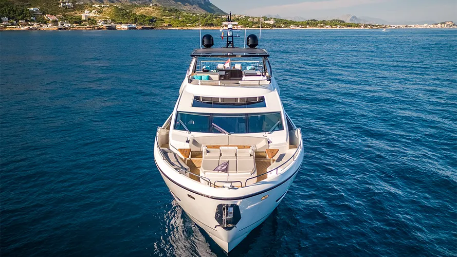 Forward, the bow lounge offers an inviting space to unwind with plush sunpads and seating, a favorite spot for morning coffee or sunset views. The flybridge is equally impressive, featuring al fresco dining, a wet bar, and panoramic views that set the stage for unforgettable moments at sea.