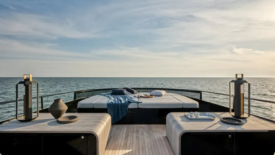 Outside, uninterrupted 360-degree views wrap around the yacht. Sun pads and lounge seating spread across the fly deck and forward bow, with sleek mesh sunshades supported by carbon poles that adjust to suit the moment – from sunrise coffees to shaded lunches.