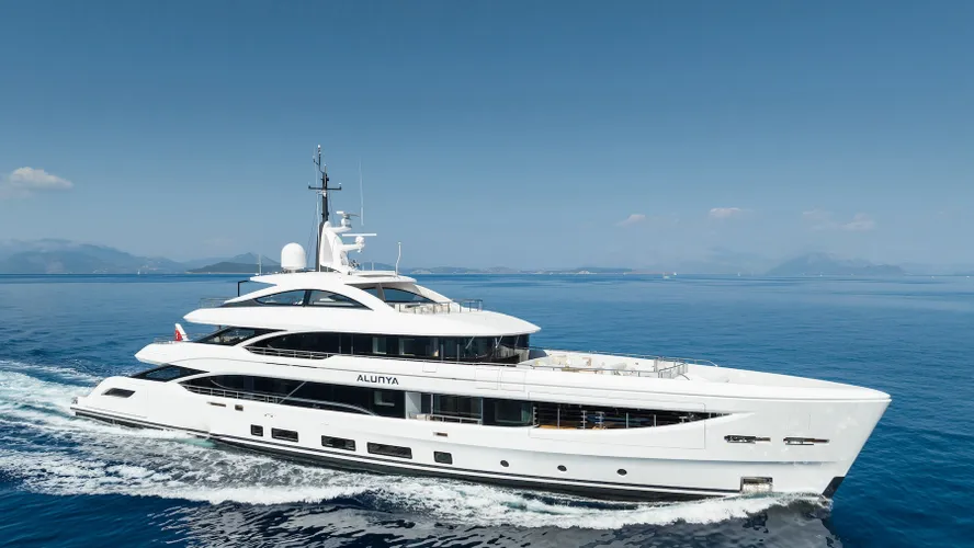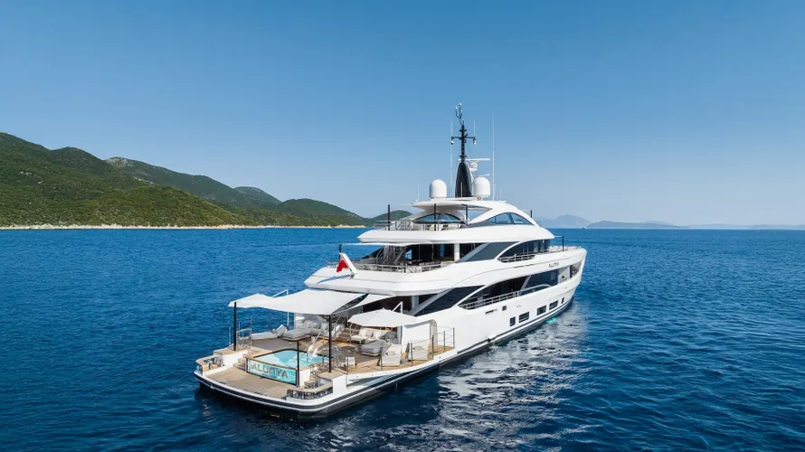 Marking Benetti’s sixth hull in its multi-award-winning B.Now 50m series, ALUNYA was launched in 2023 at the shipyard’s Livorno facilities. The renowned British design studio RWD provided the concept design and exterior styling, while the Italian studio PierLuigi Ausonio was responsible for the naval architecture. The yacht spans four decks in total, with a seamless indoor-outdoor layout, including a main saloon looking directly out onto the Oasis Deck, a revolutionary nautical design concept offering a convivial, sea-immersive onboard lifestyle with a 36 sqm beach club. The open-out wings extend the width of the deck, creating closer contact with the water, whilst providing protection from the waves. The stunning infinity pool is integrated into the heart of the socialising area, so that it is flush with the deck, giving a feeling of being close to the sea.
