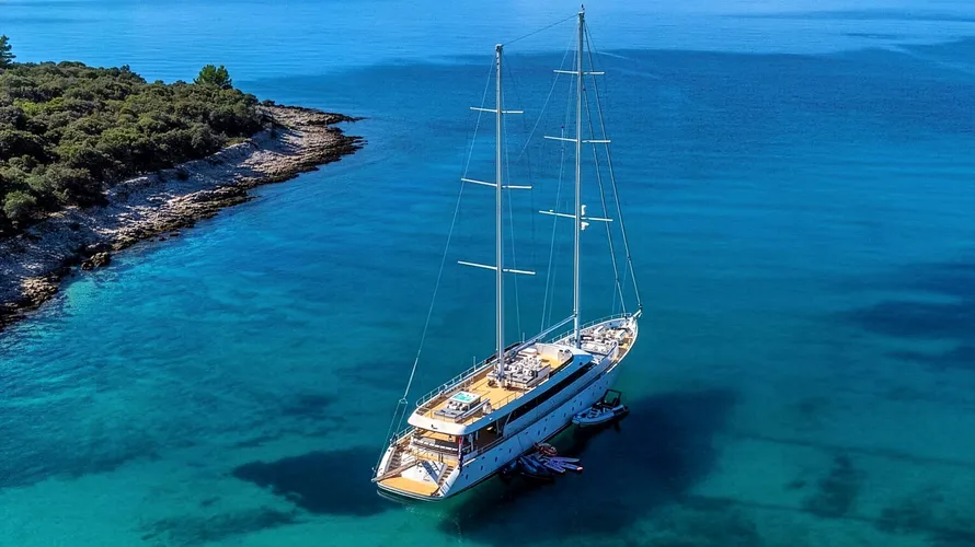 Launched in May 2020, twith extensive refit in 2025 this luxury crewed motor sailer is available for charter along the stunning Adriatic coast through BomiShip, an appointed central agency. Aurum Sky is by all means, a unique yacht on the charter market. At 43.5 meters, she offers expansive space in all areas. She accommodates up to 12 guests in 6 double en suite cabins. The cabins range between 20 m2 and 25 m2, and two can be converted to twin cabins. Equipped with a Smart TV/DVD, fridge, safe, Intercom, WiFi stralink 5G, and with room service an option, the cabins allow for an entirely private and personalized guest experience.