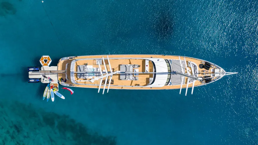 Aboard Aurum Sky, all your daily rituals are bound to be even better! Find a large Smart TV, DVD, USB iPad/iPod/mobile docking station in the saloon while the upgraded sound system links to the flybridge and cabins. Read your press in the library and get business done efficiently in the office's privacy. Aurum Sky packs many top-notch water toys and equipment for action and adrenaline, such as two jet skis, 2 Seabobs, adult and junior water skis, SUPs, fishing equipment, and kayaks. More toys are available as extras.