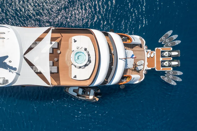 Her ample common spaces are ideal for great times together as well as wonderful moments in privacy. Relaxation seekers will appreciate the many areas to soak up the sun, from the expansive sundeck with sun loungers to the fly-deck Jacuzzi, where bubbly sunsets pair perfectly with a glass of champagne. Adventures are always an option, with a wide range of water toys available, including jet skis, water skis, sea bobs, stand-up paddleboards (SUPs), a water slide, and more. Those who favor solid ground will love the e-bikes that make it easy to explore islands and shores on a whim.