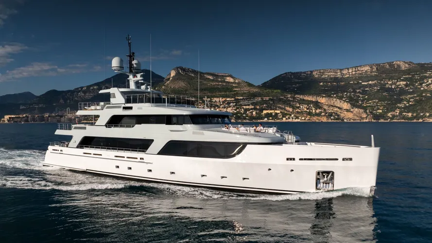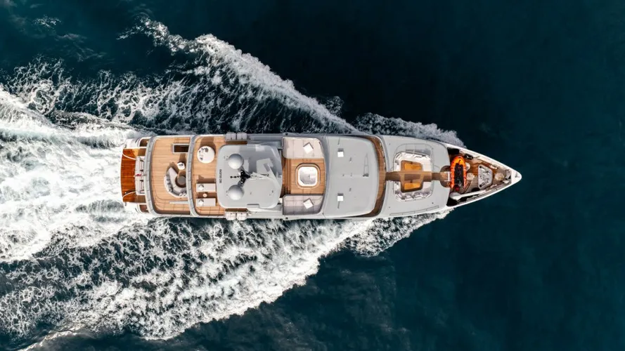 Inside, GIOIA’s interiors are warm and inviting. Light-filled and welcoming, they pair polished marbles and rich woods with a soft, contemporary touch. The main deck lounge invites sociable moments with its bar and seating areas, while the sky lounge one deck up is a snug but spacious living room with panoramic views and an easy flow out onto the upper aft deck.
