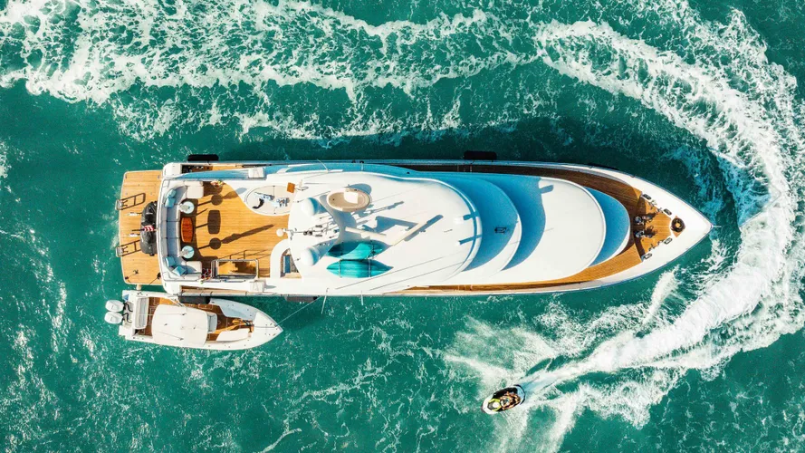 Entertainment options abound with interior and exterior bars, three al fresco dining areas, a large swim platform, and an expansive flybridge with choices for sun, shade, or soaking in the Jacuzzi. INCEPTION also has a 30′ Intrepid tender, two Jet Skis, two Seabobs, two paddle boards, two kayaks, two towables, and fishing gear.