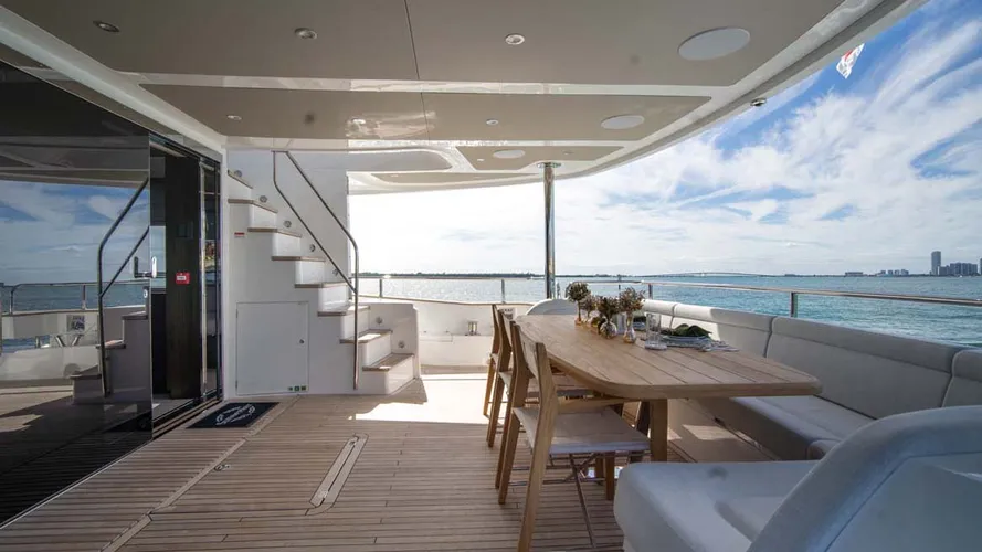 Her interiors are calm and contemporary, with darker tones lending a slightly masculine edge. Full-height windows bring the outside in, creating an easy rhythm between her interior lounges and open decks. The main salon opens to a fold-down balcony to starboard, a small but memorable detail that quickly becomes a favourite spot for morning coffees and evening aperitifs.