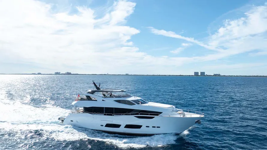 Above, the flybridge is the social heart of the yacht: Open, adaptable, and designed for long days at anchor with dining, grill, wet bar, and retractable canopy. Equally at home island-hopping in the Caribbean or cruising between Mediterranean ports, her outdoor spaces are tailored to warm-weather living across both regions. Forward, the sundeck offers a more private space, while the hydraulic swim platform provides easy access to the water.