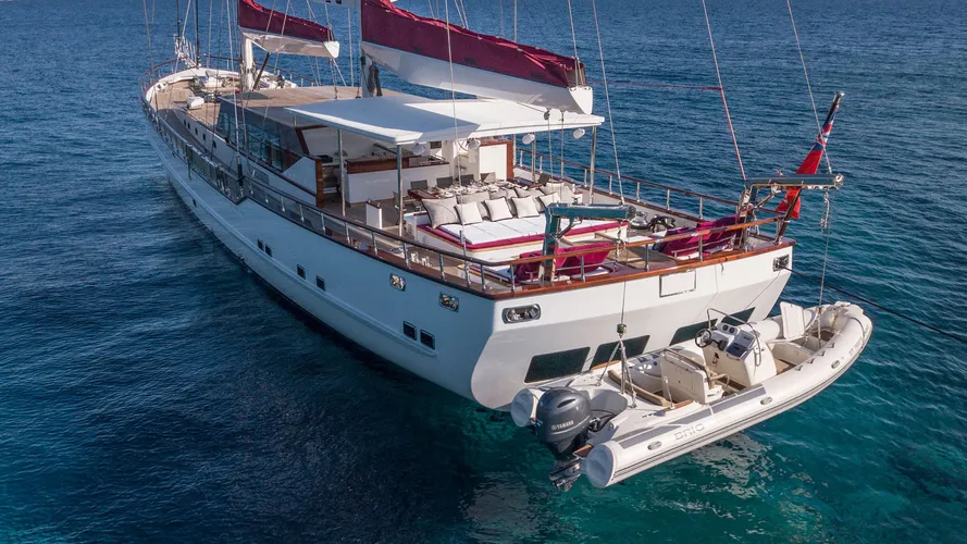 Step aboard THAT’S AMORE, a striking 42-metre luxury sailing yacht designed for unforgettable charter experiences in the Greek islands. With 6 spacious staterooms for up to 12 guests, refined interior styling, and expansive deck spaces for dining, sunbathing, and relaxing, she’s the perfect combination of classic sailing charm and modern luxury.