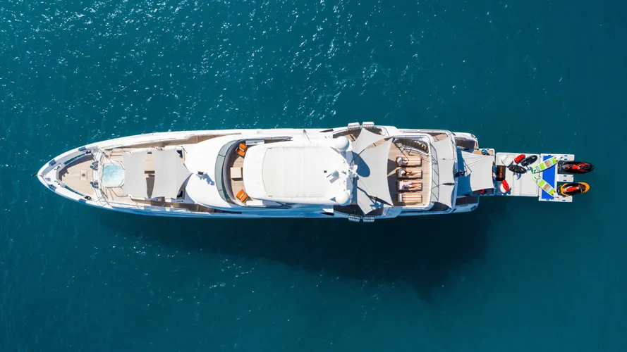 Outside, life centers around the 100-square-metre sundeck, a space designed for all hours of the day. A midship bar serves as the social hub, while the aft deck offers a wide, flat expanse for morning yoga or evening cocktails. Forward, a secluded seating nook provides a quiet spot for those seeking privacy. On the foredeck, a Jacuzzi and sunpads create a sweet little terrace for watching the yacht pull into port.