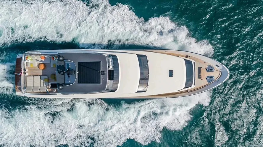 The yacht’s wide-beam layout creates an airy, spacious interior, highlighted by a main-deck owner’s suite featuring 180-degree forward-facing windows, a private office, and a dressing area. Each cabin is thoughtfully designed to provide privacy, comfort, and refined elegance. The main deck salon opens to a hydraulic fold-down balcony, seamlessly connecting indoor and outdoor living, while stylish furnishings, high-end finishes, and modern amenities ensure every moment onboard is both relaxing and memorable.