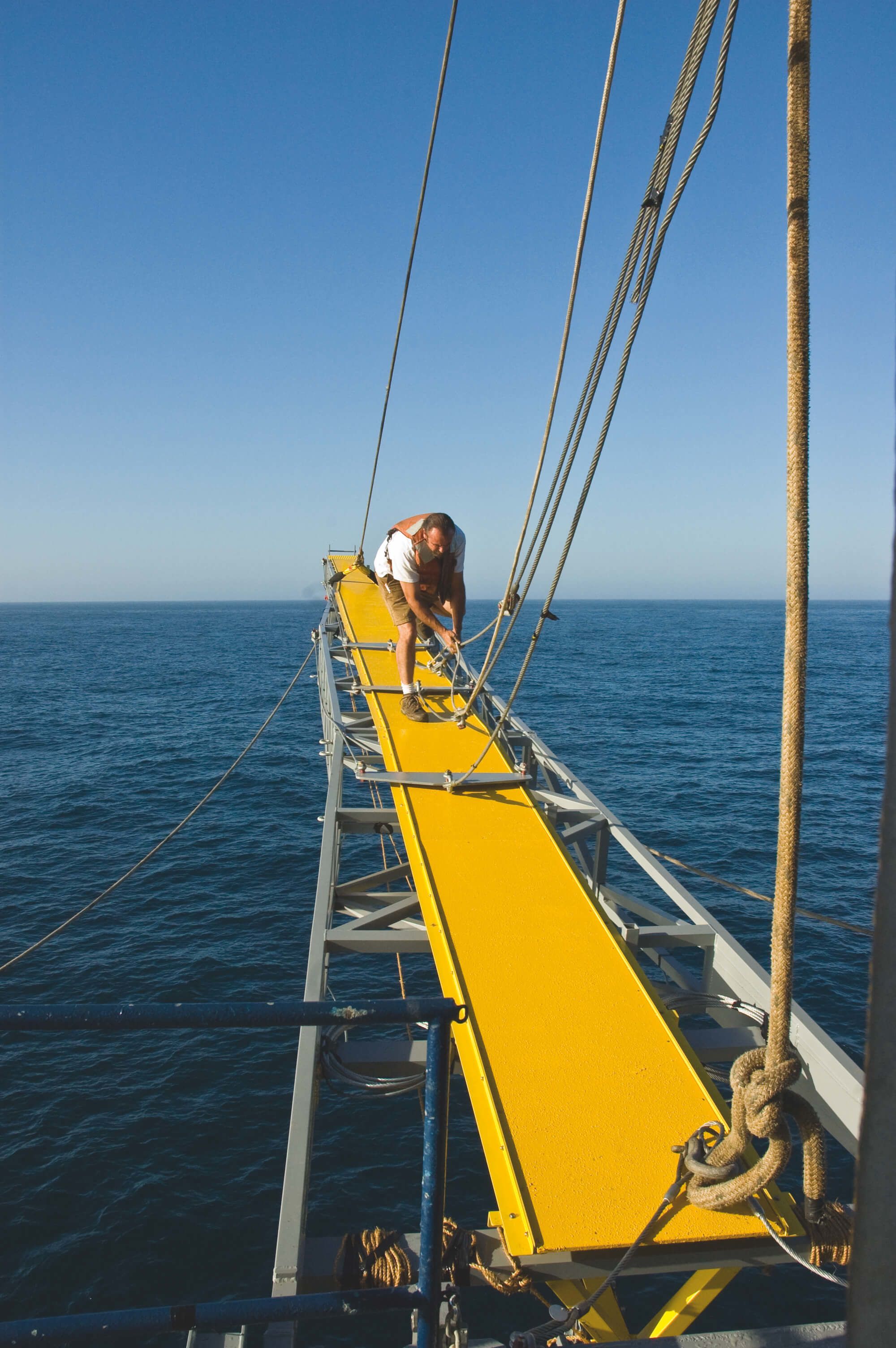 The three “legs” were in fact 10 tonnes of anchor chain with 3.8-centimetre powerbraid nylon line able to withstand 32,000 kilograms of pressure. “The trick was to put down the first ‘leg’ up-current,” says Hildebrand. “On this occasion, the currents were strong enough that, having put down the first leg, FLIP began listing at a 45-degree angle.