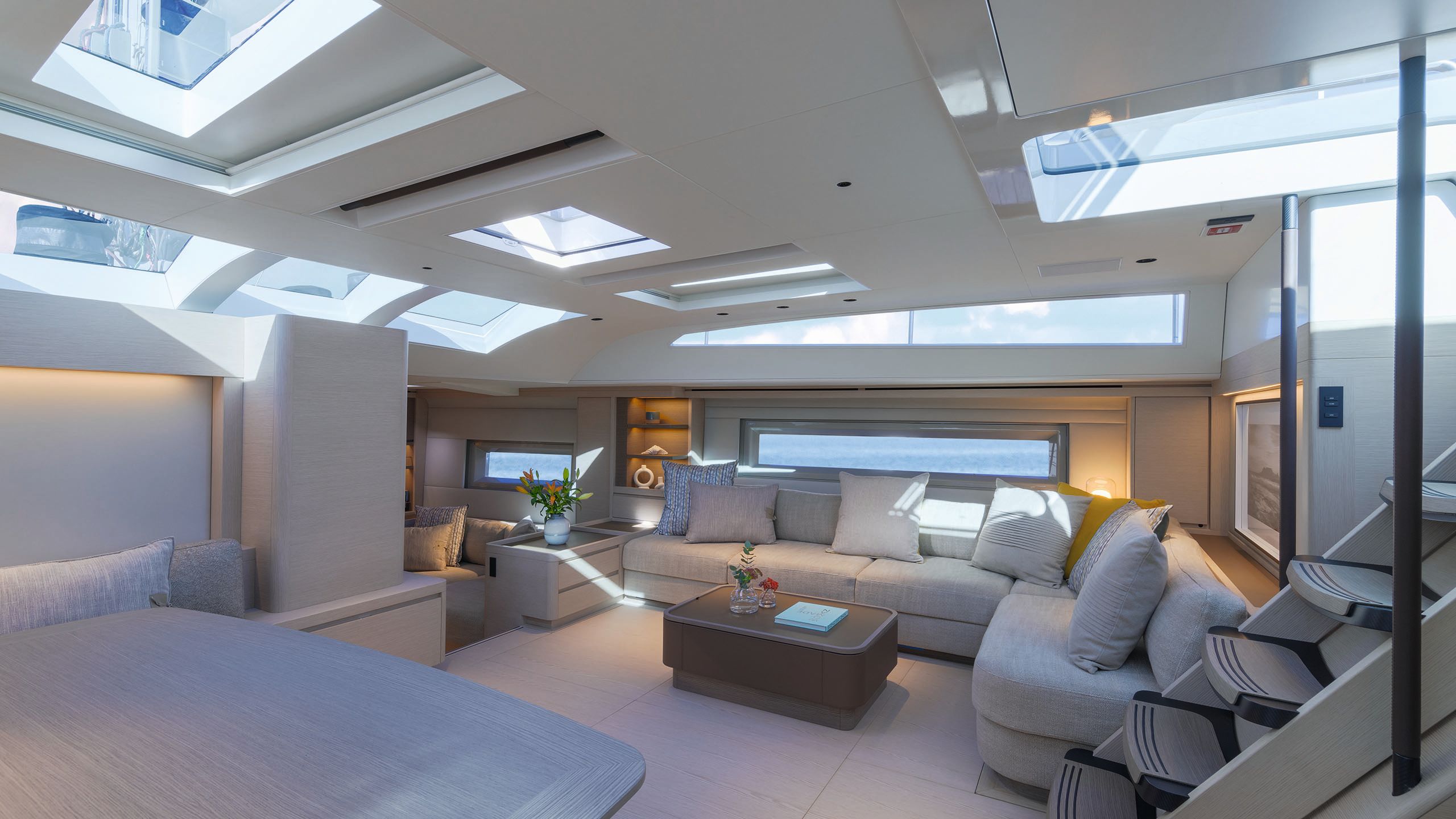 The raised saloon allows natural light to flood through the panoramic windows (top left); the owner enjoys racing and entered the 2024 Giorgio Armani Superyacht Regatta in Porto Cervo