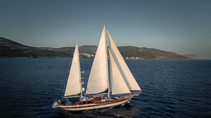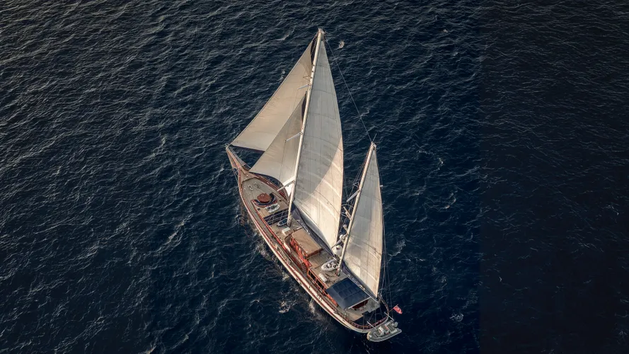 AEGEAN was constructed with a wooden hull and superstructure and is rigged as a classic ketch. Powered by twin MAN diesel engines, she offers a cruising speed of 12 knots and a maximum speed of 14 knots. She carries three tenders for guest access and water activities, with side boarding ladders on both sides for convenience and safety.