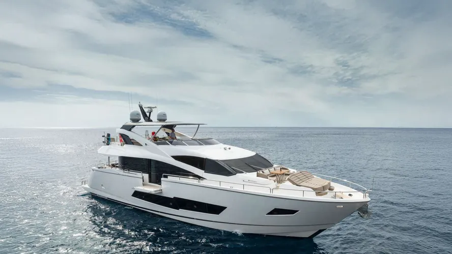 An additional side door is located on the starboard side, along with a full-height glass door and a fold-out balcony accessible from the saloon. This 86 Yacht also boasts a private bow area with sun loungers, an umbrella, and an inviting al fresco dining space surrounded by comfortable seating.