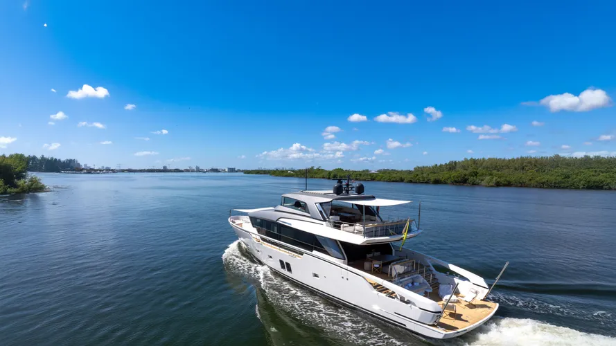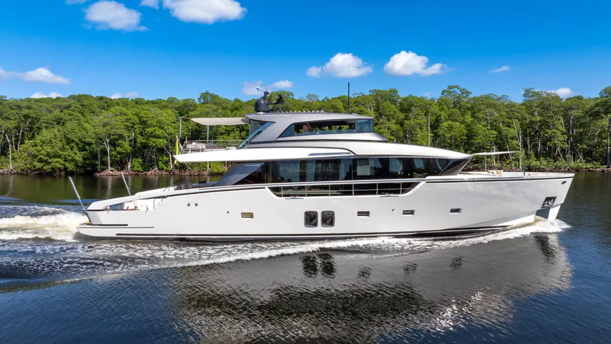With striking lines by Officina Italiana Design and interiors by Lissoni & Partners, AIDA is a standout example of Sanlorenzo’s SX88 series — where explorer edge meets the comfort and style of a flybridge model. At 27 metres, she offers a continuous main deck, a fully enclosed flybridge helm with retractable windows, and a spacious, multi-use aft deck. Triple Volvo IPS drives and a shallow draft make her ideal for island cruising and perfectly at home in the waters of South Florida.