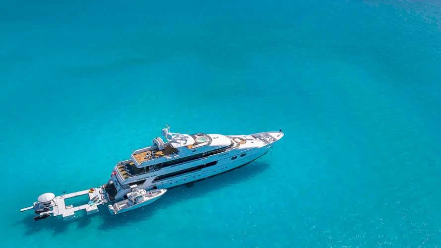 LISA MI AMORE’s interior is timeless with a touch of glamor with designs courtesy of Carol Williams & Associates. Her stunning woodwork includes striking walnut walls and cabinetry as well as some of the best marble inlay and stonework used on a yacht. The warmth of the rich wood combined with the comfortable furniture allows guests to feel completely at home. Accessed from the aft deck, the yacht’s substantial main salon is surrounded by windows and filled with natural light. A formal dining space for 12 is located forward. The skylounge is the ultimate locale for guest entertainment with spacious, comfortable seating and a sunken bar with oversized bar chairs. The large windows allow guests to take in the passing views no matter where they sit. Alfresco dining can be enjoyed in many areas of LISA MI AMORE, be it on the aft deck, skylounge aft or on the sensational sundeck. The sun lounges on the skylounge aft are perfect for sunbathing. LISA MI AMORE’s sundeck welcomes guests to enjoy her Jacuzzi surrounded by sunpads, grab a drink at the bar and enjoy the unobstructed views. The yacht’s sundeck has the ability for a touch-and-go helicopter pad when required. LISA MI AMORE’s impressive selection of water toys adds even more value to this opulent superyacht.