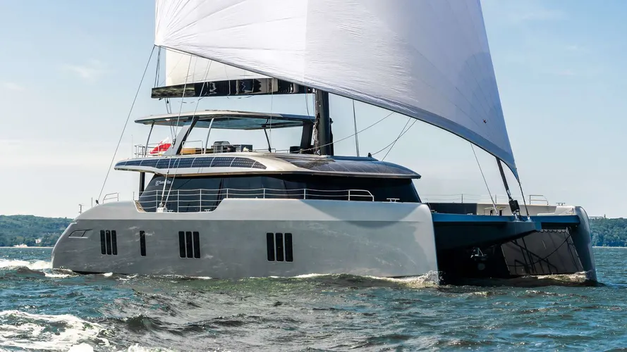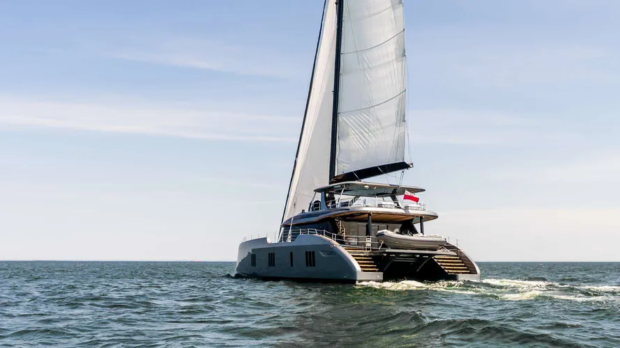 The 23.99m Sunreef 80 Eco catamaran, APOLLO 99, represents the pinnacle of sustainable luxury yachting, presenting cutting-edge green technology and an ultra-modern design. Built by the renowned Polish shipyard, Sunreef Yachts, this brand-new sailing catamaran offers an eco-friendly cruising experience without compromising on luxury. With a beam of 11.53m, she delivers expansive living spaces, panoramic views throughout.
