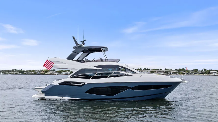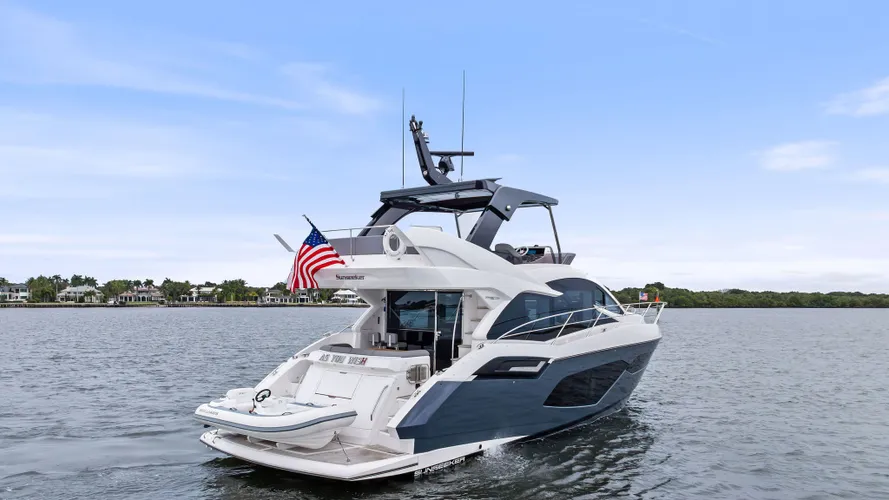 As You Wish is a highly customized or well-equipped Sunseeker Manhattan 55 (a popular model) that signifies extensive optional upgrades and features chosen by the owner, such as premium wood finishes (smoked eucalyptus), hardwood flooring (Cadorin), upgraded galley/wet bar options (icemaker, BBQ), teak decks, advanced AV systems, and personalized interior fabrics, all designed for luxurious entertaining and cruising.