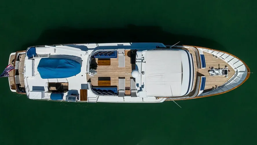 - Expansive flybridge with a 20' tender deck, grill station, seating and lounging areas, and workout equipment