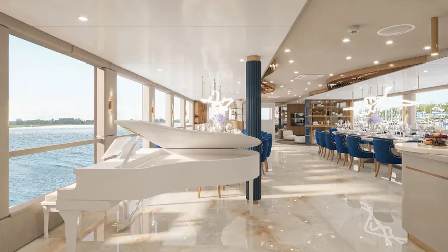 Expansive exterior decks are designed for relaxation and entertainment. The top deck features an enclosed gym, allowing guests to stay active while enjoying breathtaking views. After a workout, unwind in the large aft deck hot tub, or sip cocktails at the full-size bar, which offers convenient access to the galley for seamless service by the crew. The day head inside the gym adds to the convenience. BELLA also boasts an extensive toy list that includes 3 Seabobs, 2 Jet Skis, inflatables, scuba equipment for 12 guests, a Nitrox Systems dive compressor, and much more, ensuring endless excitement on the water.