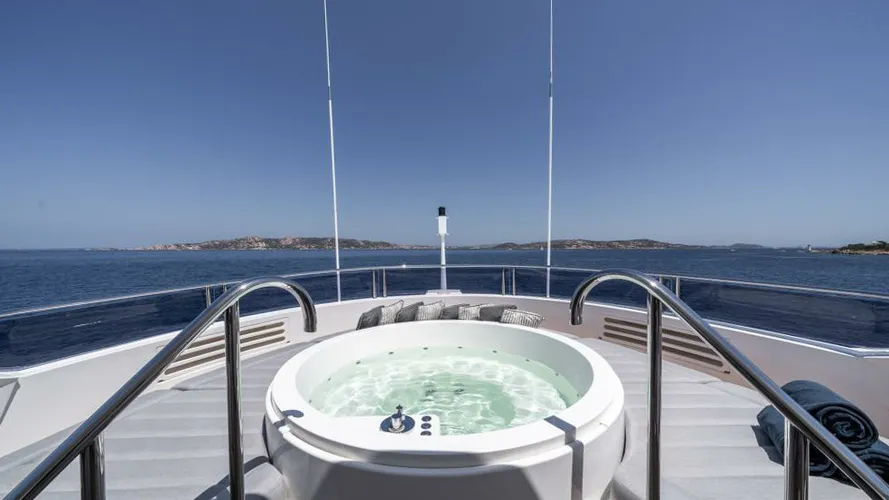 The Sunseeker 131 benefits from several structural improvements over the earlier 40M series. The upper deck extends 2.5 metres further aft, and the sundeck has been lengthened by 1.5 metres. These subtle shifts create more generous al fresco lounging and dining spaces, while retaining the distinctive angular cut-outs and bold lines that make her unmistakably a Sunseeker. The upper deck aft centres around a large circular teak dining table with seating for 10, an optional upgrade chosen by the owner. Above, the sundeck is fitted with a retractable awning, a built-in Jacuzzi flanked by sunpads, and a glass-topped sit-up wet bar shaded by the hard top. Zoned audio is installed across every deck, with no fewer than eight Sonance speakers and subwoofers on the sundeck alone. Additional outdoor spaces include a casual U-shaped seating area with teak coffee table on the main deck aft, and a similar setup with integrated sunpads on the foredeck.