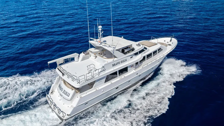 BRAVO ZULU accommodates 6 guests in 3 staterooms plus crew for 3. Her full beam main salon is incredibly spacious and great for entertaining with a full-sized teak dining table and full bar area. The aft deck and flybridge areas also offer generous spaces for entertaining and relaxation. BRAVO ZULU features an oversized swim platform that is great for diving and in-water activities.