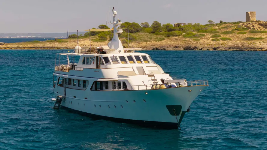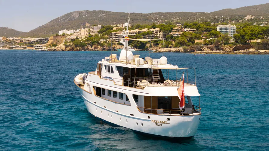 With her traditional canoe stern, teak decks and classic lines, DAYLAMI offers the atmosphere of a bygone age with modern comfort. Powered by twin General Motors engines, she cruises at 8 knots with a top speed of 14 knots and a range of 1,200nm—ideal for relaxing Mediterranean or island cruising.