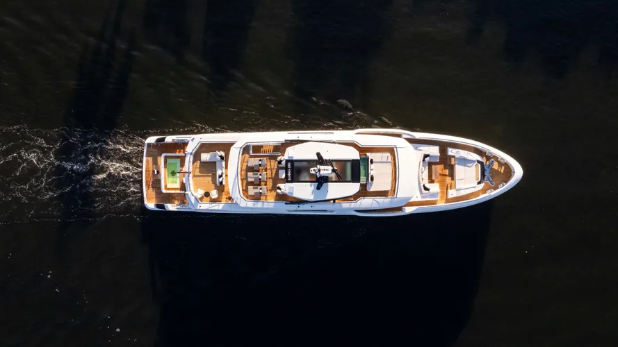 Wide side decks lead forward, offering direct owner’s access to the bow. Here, a generous foredeck lounge is arranged with ample sunbeds, comfortably accommodating all guests in a private and relaxed setting. Entering the main salon through fully retractable glass doors, the interior reveals a remarkable sense of space—more commonly found on significantly larger yachts. The layout is elegantly arranged with a spacious lounge and formal dining area, subtly divided by a refined central feature that enhances both functionality and visual flow.