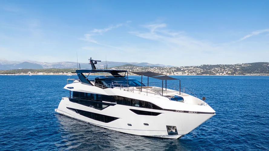 The Sunseeker 100 Yacht combines power, elegance, and presence, setting the standard in its class. A broad garage holds a Williams 460 and jetski, while exterior highlights include a hydraulic platform, spacious bow, private owner’s terrace, and a vast flybridge.