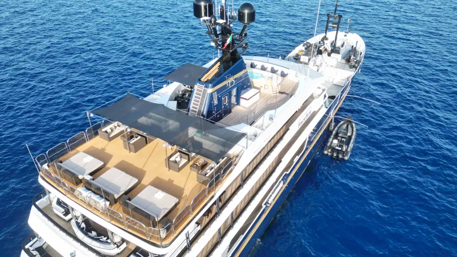 Last refitted in 2022, this 1,325GT expedition yacht, which has exterior design by H2 Yacht Design and interiors by Michele Bonan. Guest spaces feature spacious lounges, expansive deck spaces and impressive entertainment areas including a cinema and a very large bridge deck bar, BBQ and dining area that converts into a disco.