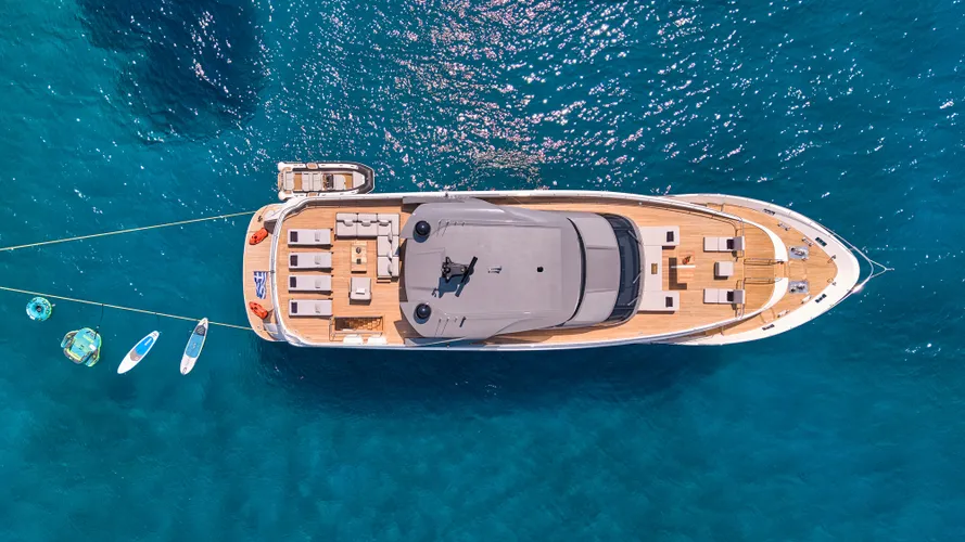 Her exterior layout is equally impressive. The innovative walk-around flybridge, for which the yacht has received notable recognition, is designed entirely on a single level with no steps or obstacles from aft to foredeck, enhancing usability and guest flow. Ample lounging areas, a sun-drenched foredeck, and al fresco dining spaces make outdoor living as enjoyable as it can be.
