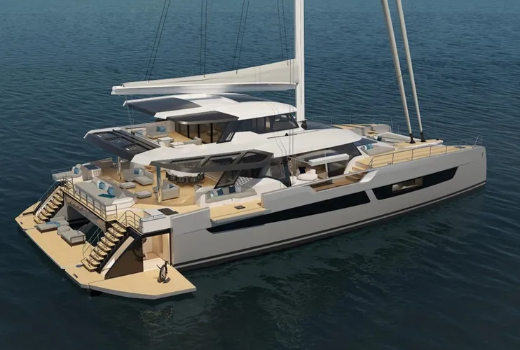 Flexible interior arrangements provide 4, 5 or 6 ensuite double staterooms, ensuring generous accommodation for family and guests or exceptional charter business opportunities. The massive volume of 450+ GT delivers comfort and space comparable to larger yachts, while the catamaran platform enhances stability, efficiency, and long-range capabilities.The flybridge spans nearly the entire main deck, featuring multiple areas for dining, lounging, and navigation.