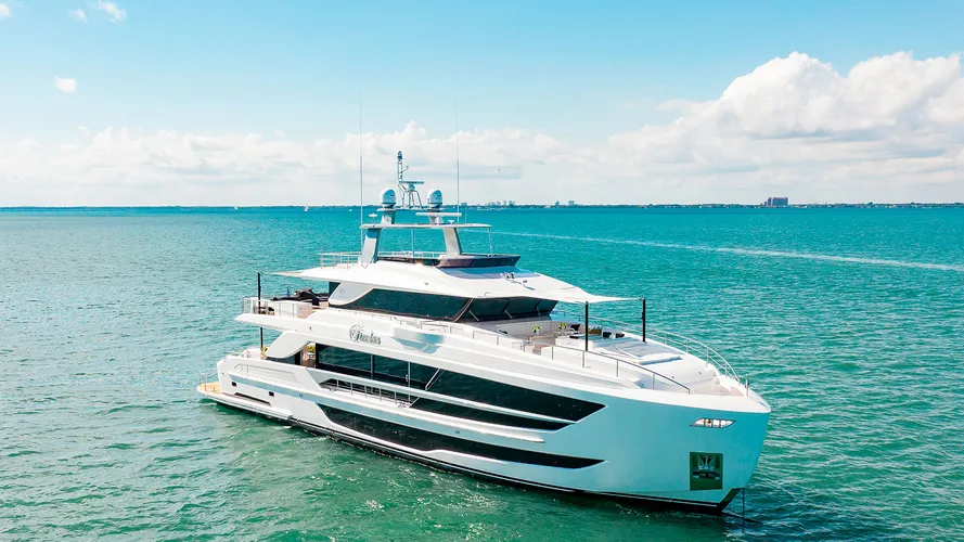 A meticulously crafted, FREEDOM is a stunning 2023 Horizon FD110 Tri-Deck, designed for modern luxury and comfort. She boasts a 5- stateroom layout including main deck master suite with His & Her Heads.