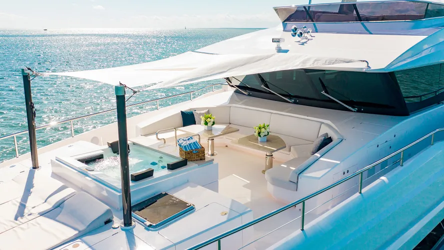 - Three-person Jacuzzi at bow entertaining area.