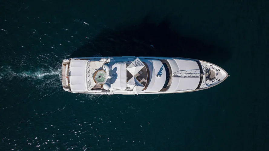 GIORGIA I offers expansive outdoor living and refined interior spaces across three decks. Highlights include a panoramic sky lounge with bar, a full-beam Owner’s Stateroom on the main deck with private office, and a spacious sundeck featuring a hot tub.