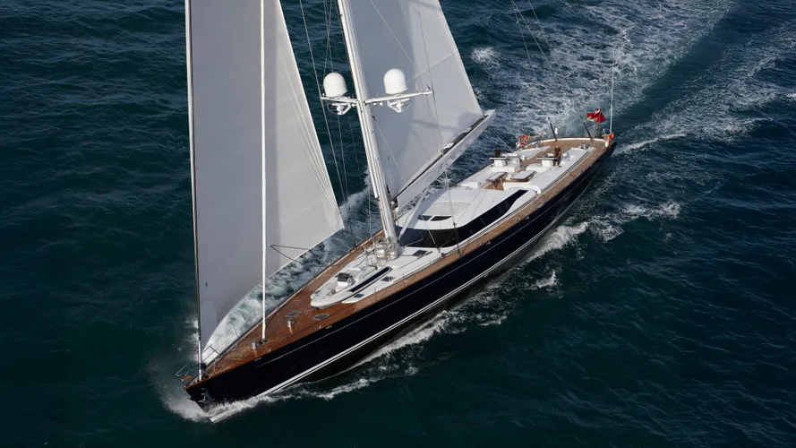 IMAGINE is equipped with a 61.9-metre mast by Southern Spars, carbon fibre rigging, and a furling boom. She carries an 895 sqm sail plan upwind, managed by captive winches engineered and built in-house by Alloy Yachts. These systems, together with her lifting keel, provide the versatility to balance shallow-water access with offshore performance. All sails have been upgraded over the years, and her North Sails jib is brand new for 2025. Under power, she is driven by a single Caterpillar C18 engine. A diesel-powered tender eliminates the need for refuelling outside.