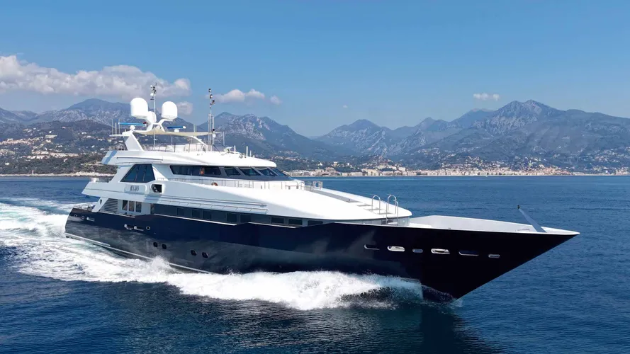 With sleek, modern lines and an aluminum hull, KIJO combines performance with elegance. She reaches a top speed of 26 knots and is powered by twin MTU engines, offering both speed and comfort for long-distance cruising. Her contemporary interior, designed by Terence Disdale, features spacious living areas, five luxurious staterooms that accommodate up to 12 guests, and an attentive crew of 8. Guests can enjoy amenities such as a sun deck with a jacuzzi, alfresco dining areas, a range of water toys, and elegant lounge spaces both indoors and out.