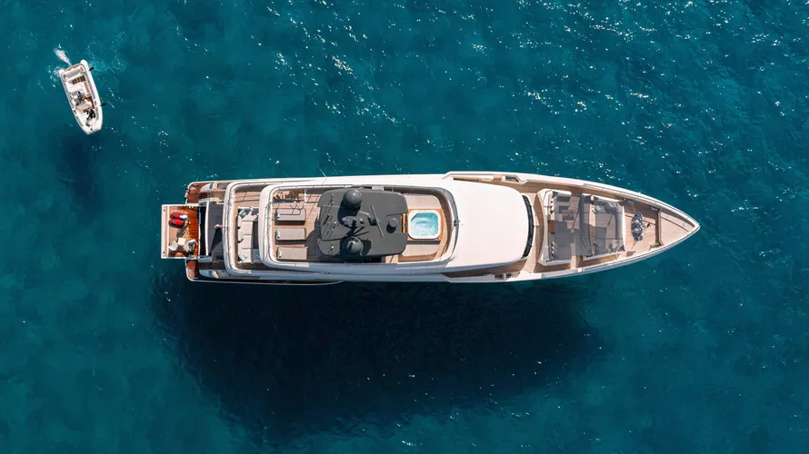 Outdoor spaces are substantial, with a large upper deck arranged for dining and lounging, complemented by an impressive bow lounge. The flybridge is generously proportioned and furnished with pieces from Kettal, Dedon, Minotti, and Roda, offering ample space for dining, lounging, and relaxed use throughout the day. At the waterline, Custom Line’s dual-mode transom system provides direct access to the water, operating as either a float-in tender garage or swim platform.