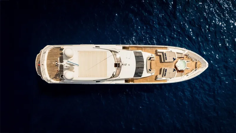 Exceptional outdoor living includes the aft deck built around a central bar, providing seamless flow to the main salon and the high-low swim platform. On the flybridge, guests can enjoy a spacious deck with retractable sunshade, a second bar, loungers, seating and dining areas with panoramic views. Forward on the foredeck is a private retreat featuring a Jacuzzi, sunbeds, additional seating, and an optional sun shield canopy—the perfect escape.