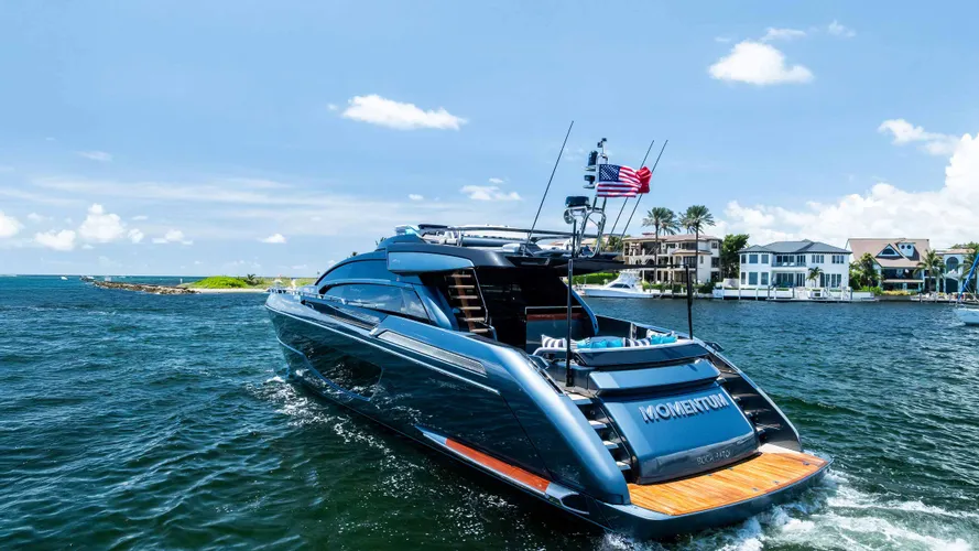 The "MOMENTUM" is a pristine example of the popular 76' Perseo Super. Hull # 31 of this venerable series has a unique aft deck bar in lieu of the aft facing lounge. Her unique designer interior matches the cool custom "Blue Jeans" exterior color.