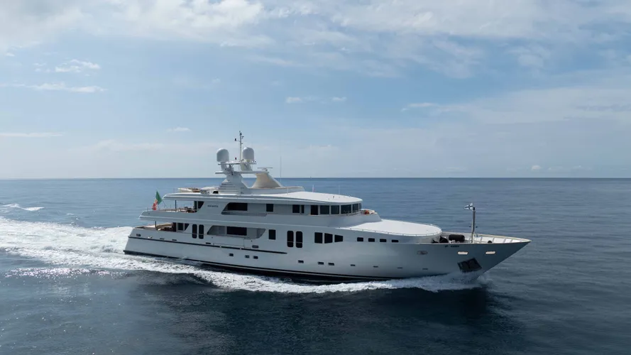 The NEW MASTER is a distinguished 44.46-meter Baglietto superyacht, epitomizing Italian craftsmanship, modern elegance, and exceptional performance. Launched in 2001 and extensively updated over the past six years, this tri-deck displacement vessel features a robust steel hull and a lightweight aluminium superstructure, ensuring durability and agility at sea.