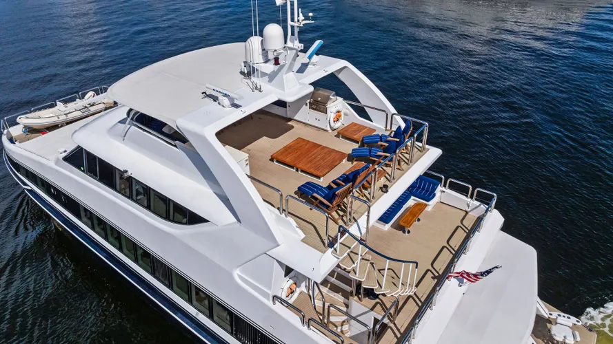 Just aft of the Master Stateroom, the private owner's deck offers seamless access to the flybridge. This outdoor haven features custom L-shaped seating and a chic cocktail/dining table, perfect for soaking in the views or entertaining in style.