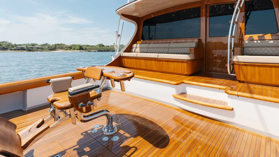 QUEEN BEE is designed around a seamless transition between performance and comfort. The aft deck is purpose-built for fishing, offering a highly functional space that connects directly to the main salon. Inside, the salon is arranged for both relaxation and socialising, with a U-shaped lounge to port, a booth dining area and an integrated entertainment system.