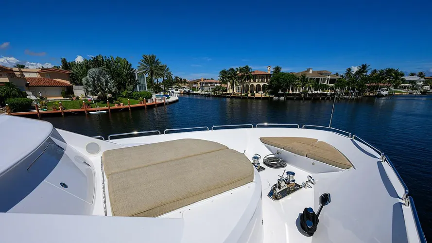 On deck, REMY ROO offers well-planned exterior spaces for entertaining and relaxation. The aft deck includes a built-in settee, bar with sink, fridge, and icemaker, and easy boarding via port and starboard gates or carbon fiber Tide Ride stairs. The flybridge features three powered Stidd helm chairs, teak decking, a bar with grill and seating, and a custom sun awning over the Jacuzzi and lounge area. Recent work includes new teak decks installed on the boat deck and flybridge. The foredeck was reconfigured to include a sunpad with integrated dive gear storage, including room for eight scuba tanks and eight full dive kits, ideal for water-sport enthusiasts.