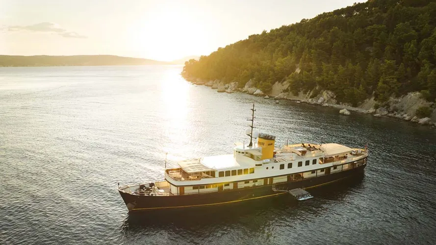 She is now a successful charter yacht, counting among her guests royalty and celebrities alike—His Majesty King Frederik X of Denmark is, reportedly, a fan; Bono once whiled away a day upon her sun-warmed teak decks. She can accommodate up to 12 guests across seven cabins, including five double cabins and two twins. She is helmed by Captain Vojo Vujsic—a sailor in his youth and a former pilot—working alongside Ivan Puco, a creative chef specialised in Mediterranean cuisine, and well-studied in both pastry and dessert making.