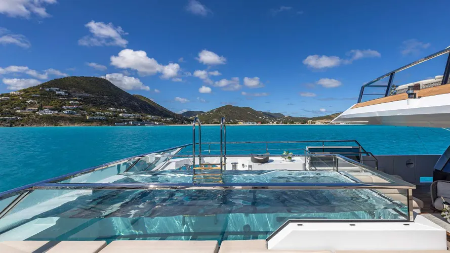 Her interiors, by Officina Italiana Design, are light-filled and contemporary, with a refined palette of white, taupe, beige, and warm brown leathers, accented by glass, marble, and reflective surfaces that amplify space and elegance. Outside, her sleek, modern lines are punctuated by signature features: a glass-bottom pool and a drive-in tender bay that transforms into a full-beam beach club with floating terraces, perfect for entertaining or relaxing in style.