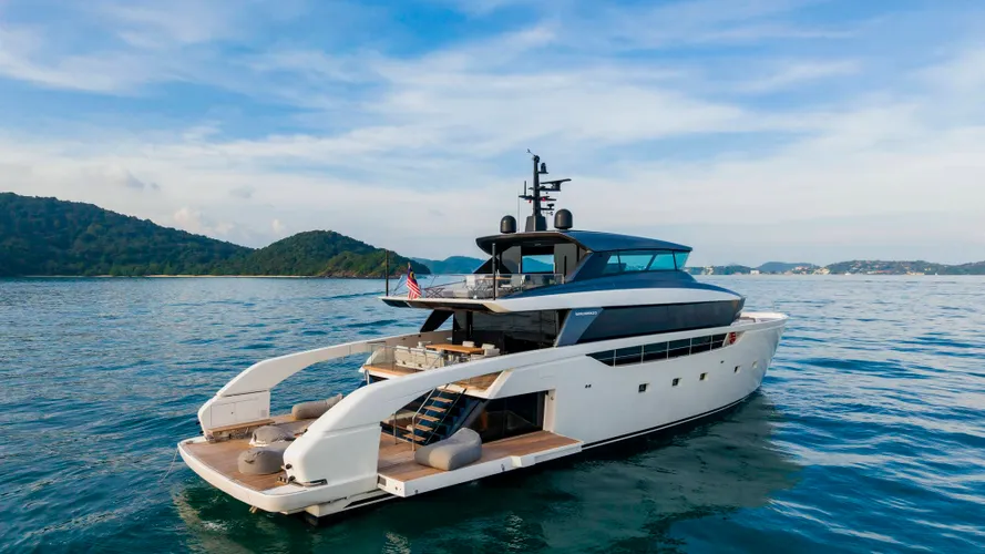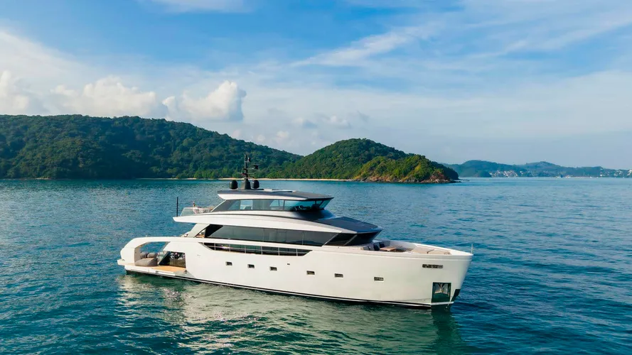 The Sanlorenzo SX100 is a luxurious and innovative motor yacht blending classic elegance with modern design, featuring a unique cross-over concept that combines the spaciousness and comfort of a long-range cruiser with the sporty lines and performance of a traditional yacht.