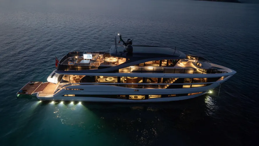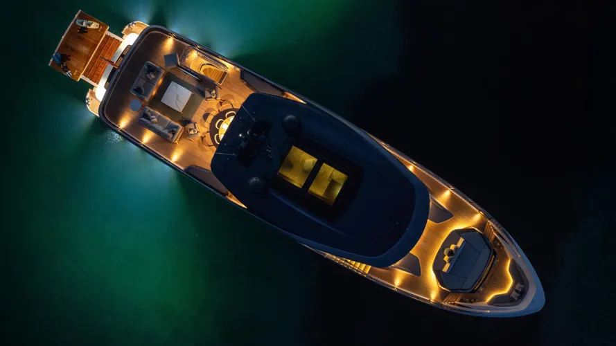 Experience superyacht space as you enter the main deck saloon, with a line of sight through the forward window and, thanks to the new open bow design, to the expansive views beyond. Ascend the internal staircase to the upper deck, and another unique experience awaits: the fully enclosed and climate-controlled sky lounge.